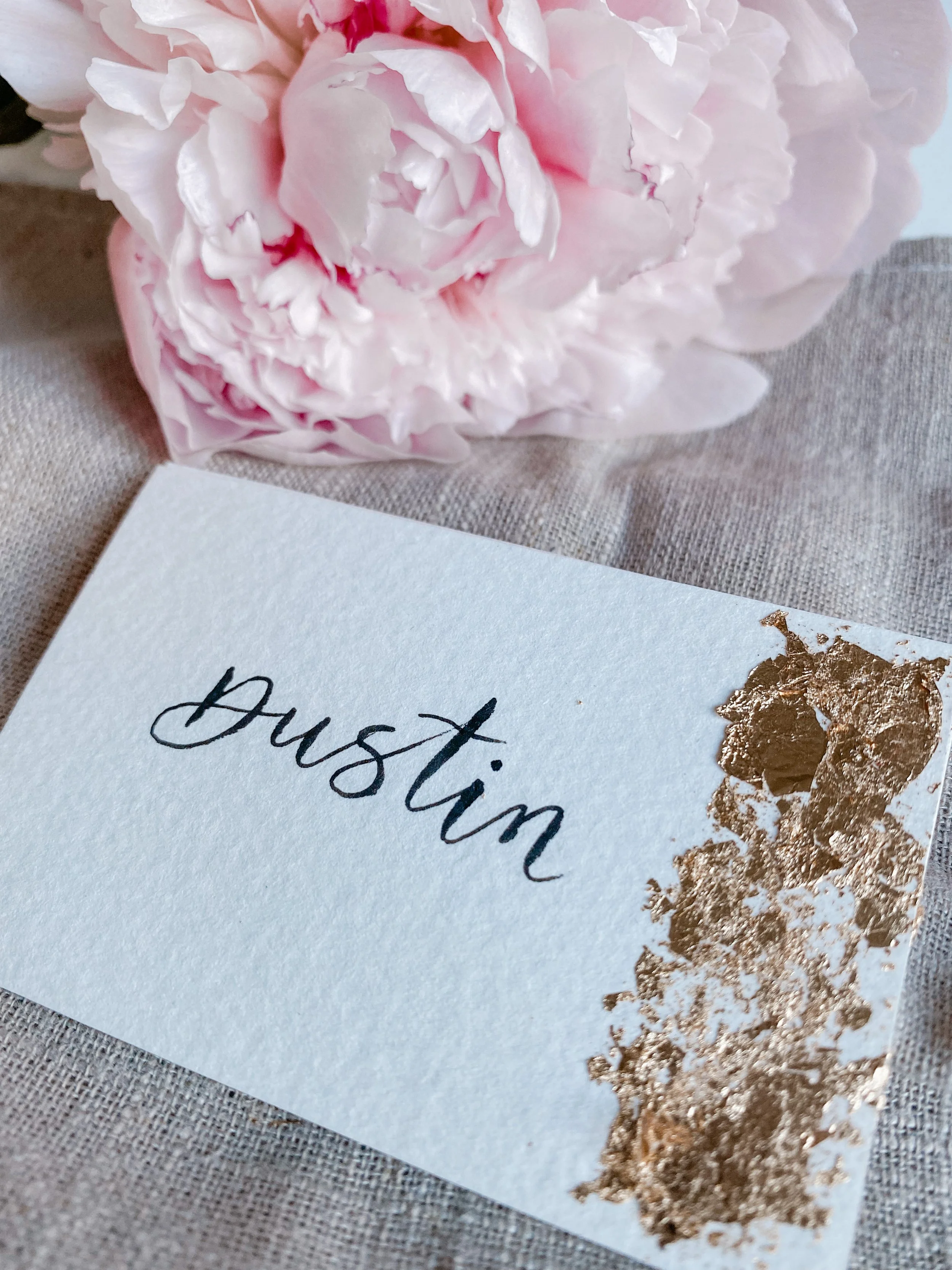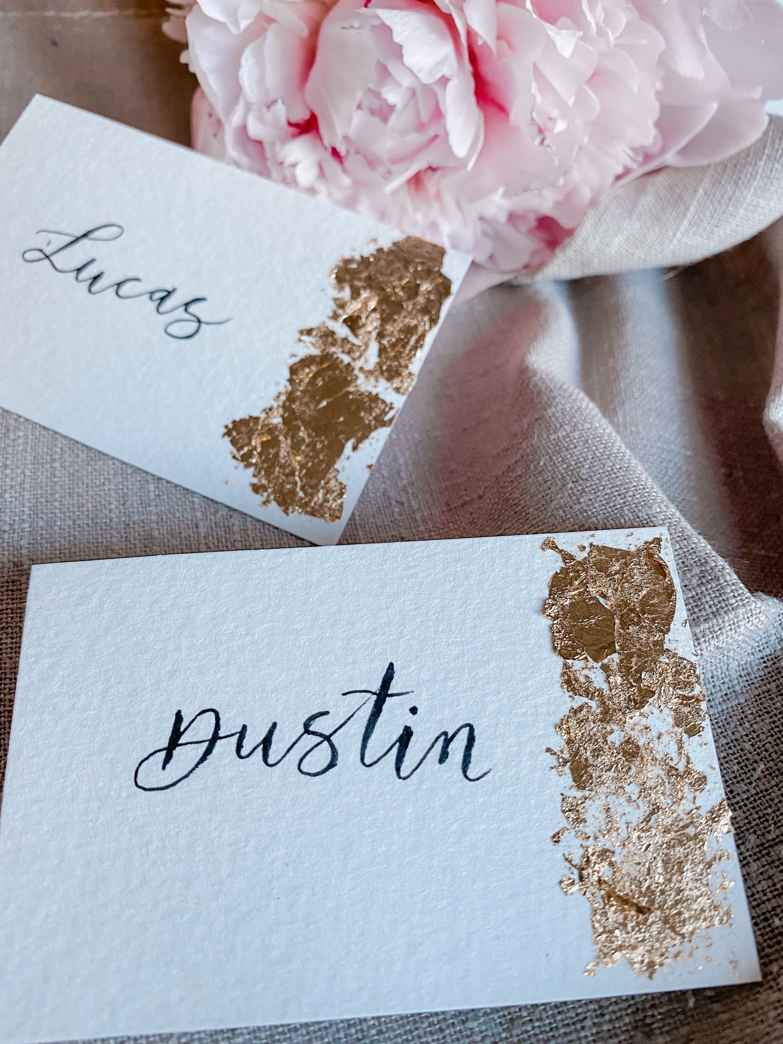 Ik maakte deze naamkaartjes op 300 gram aquarelpapier die ik op maat sneed. Verder beschilderde ik ze met lijm en bladgoud, en schreef daarna de namen op in moderne kalligrafie met een Tombow Fudenosuke Brushpen.